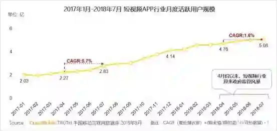 QuestMobile的数据显示,从4月份监管加强后,短视频用户整体增长态势急剧放缓,从4月到7月,短视频APP行业月度活跃用户规模仅从4.76亿增长到5.08亿,复合增长率仅为1.6%,远低于去年同期的5.7%。