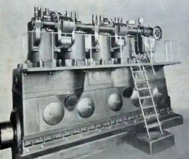 1914年,英国发明制造的4冲程船用发动机。