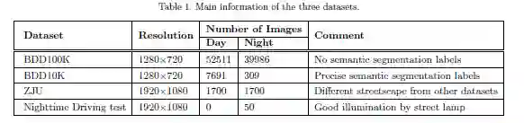 本文首先介绍了BDD数据集(BDD100K和BDD10K),ZJU数据集和Nighttime Driving test数据集。他们的图像分辨率,白天以及夜晚图像数量,标注信息如Table1所示: