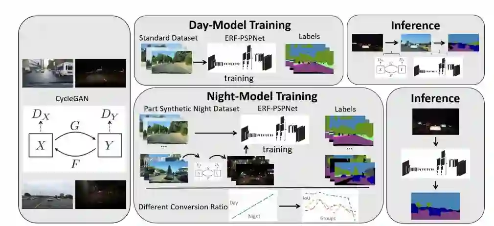 在我们的工作中提出了两种方法来缩小语义分割中白天和夜间图像之间的差距。这两种方法分别为将白天域图像转换为夜间域图像和夜间域图像转换为白天域图像。Figure1展示了我们的框架。我们训练一个CycleGAN来执行跨域转换。在第一种方法中,我们将夜间图像转换为白天图像,然后在白天图像上训练ERF-PSPNet。在第二种方法中,CycleGAN将训练集的部分白天图像转换为夜间图像,以扩展数据集的域覆盖范围。最后,我们用调整后的具有一定百分比的夜间图像的训练数据训练ERF-PSPNet,达到提高夜间语义分割模型性能的目的。