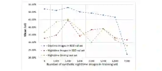 在本文中,我们研究了夜间场景的图像语义分割问题。为了提高性能,通过CycleGAN训练双向昼夜转换器,提出了两种方法。在第一方法中,推理过程将夜间图像即时转换为白天图像,作为预处理步骤。在第二种方法中,将训练集的图像通过CycleGAN部分转换为夜间合成图像,从而提高了分割模型的鲁棒性。我们的实验在三个数据集上进行了测试,并证明了该方法的有效性。总而言之,我们的方法显著改善了夜间图像语义分割模型的性能,从而使诸如ERF-PSPNet之类的SOAT网络在夜间拥有较好的鲁棒性。