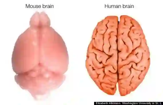 ►鼠脑光滑,人脑充满了沟回的结构。图片来源:huffingtonpost.com