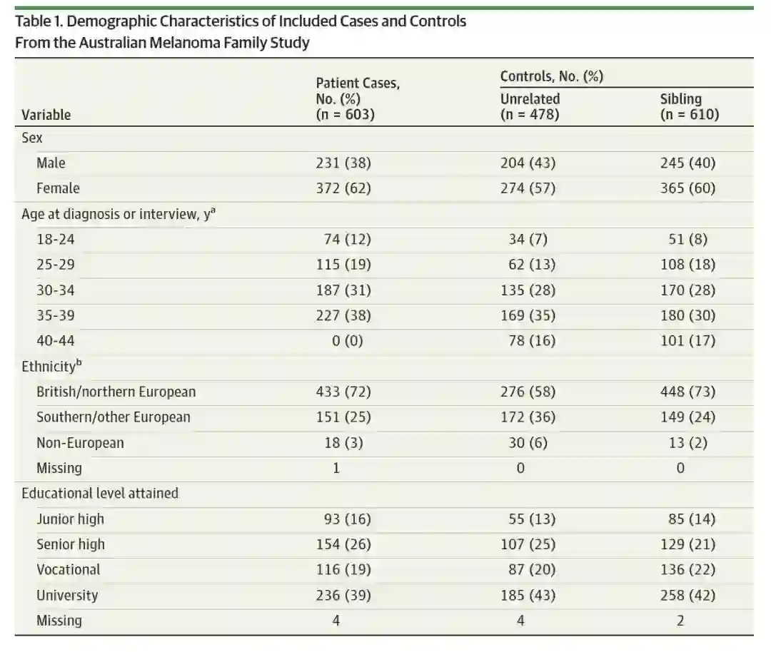 研究分析时纳入603例患者和1088例对照者,入组人群年龄<45岁,均有详细的防晒霜使用史。对照组由478例非相关对照(选民对照和配偶、朋友对照)作为主要分析,610例姊妹对照作为次要分析。入组人群的基线特征总结见下表1,患者的中位年龄为32岁,非相关对照和姊妹对照的中位年龄分别为35和34岁。每组人群中,女性比例高于男性。