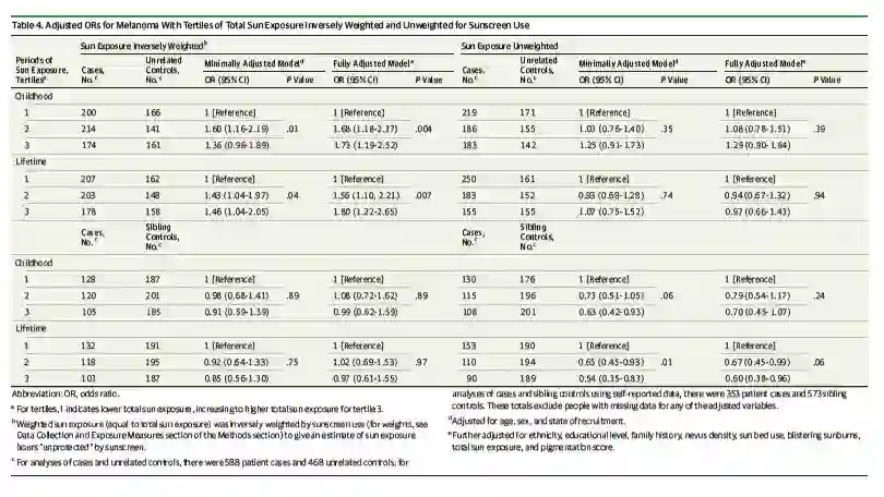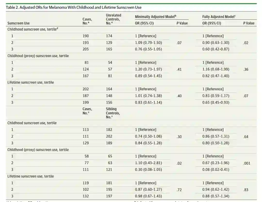 表2. 儿童和一生中防晒霜的使用和黑色素瘤发病风险的关系
