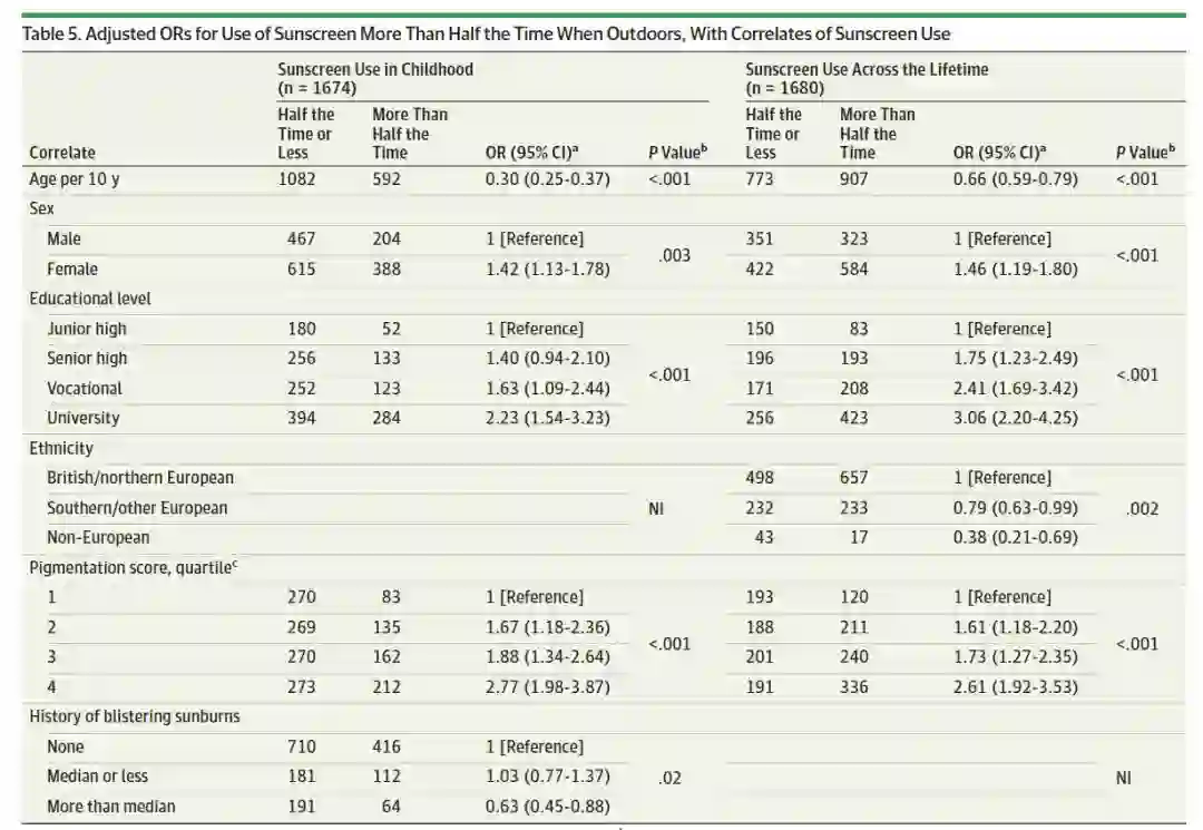 影响防晒霜使用的因素:儿童时期规律使用防晒霜的人群(即外出时超过1半时间使用)多见于女性,年轻,高学历,皮肤色素沉着较浅和有较严重的晒伤史,见下表5.
