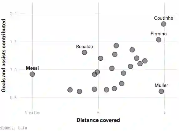 本赛季欧冠(唯一公布了基本跑步数据的比赛),梅西也比其他精英前锋都跑得要少,平均每90分钟少5英里的距离。