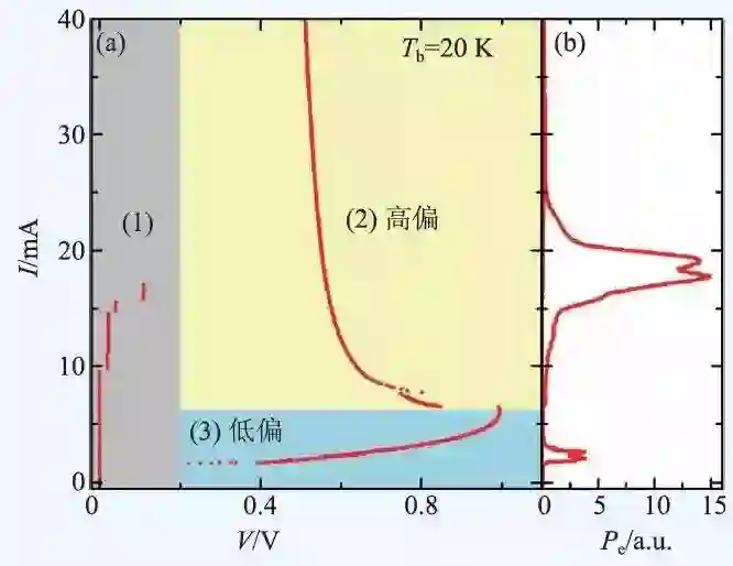 器件处于如图5(a)中所示的灰色区域(1)时,所有或绝大部分本征约瑟夫森结均处于零电阻状态。接触电阻、少量结跳变至电压态都会导致实际测量时存在非零的器件电压,通常这个电压较小,对于含有600 个结的器件来说,在20 K时这个电压一般不大于0.2 V。在这个区域,不存在太赫兹辐射。