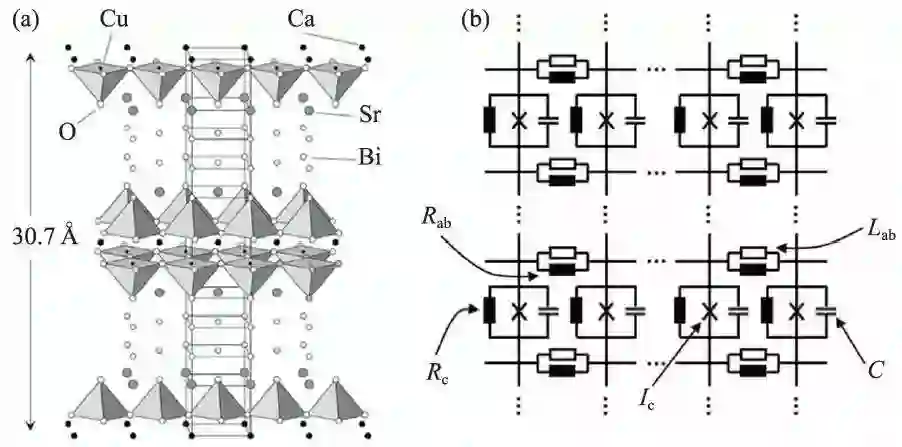 图1 (a)Bi2Sr2CaCu2O8单晶的晶体结构图;(b)串联的本征约瑟夫森结阵的等效电路
