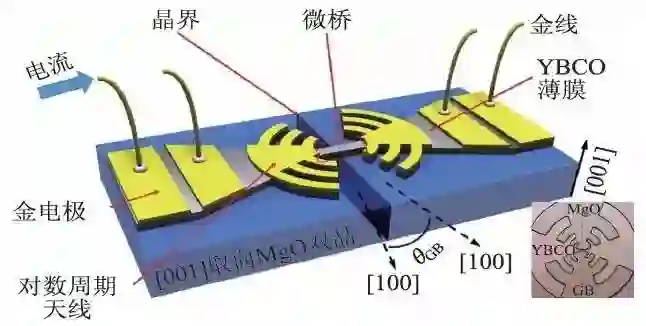 高温超导YBCO双晶约瑟夫森结太赫兹检测器的结构如图3 所示,YBCO薄膜生长在太赫兹透射率较高的双面抛光的MgO双晶基片上,薄膜的超导临界电流密度为Jc=1.9 MA/cm2,厚度为80—100 nm。双晶晶格取向夹角θGB 为对称的24°,此角度双晶结的特点是超导临界电流Ic 较大、特征电压IcRn 在欧姆量级、高频响应好。在超导薄膜表面则蒸镀有20—100 nm厚的金膜作电极与天线。通过光刻、离子铣等微加工手段在超导薄膜和金膜上制备出微桥和对数周期天线,微桥的尺寸可根据实际研究需求而进行调整,典型宽度为1—3 μm,长度为1—6 μm。