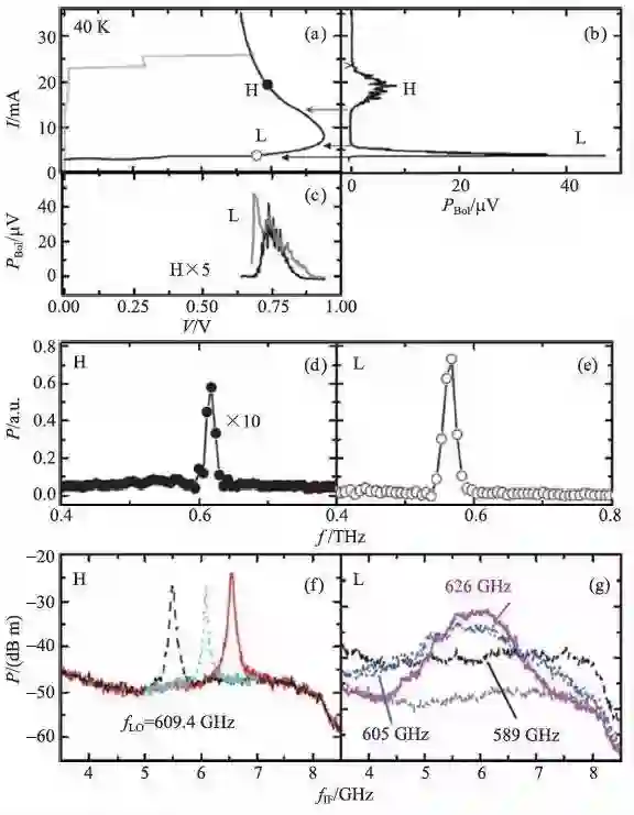 高偏区域的太赫兹辐射特性则由于上述的温度分布而更值得讨论。图9 所示的超导集成接收机(Superconducting Integrated Receiver, SIR) 测得超导太赫兹辐射源辐射线宽的结果显示,高偏区域的辐射线宽非常窄,而低偏区域的线宽较宽。所测量的超导太赫兹辐射源在高偏和低偏都有辐射,如图9(a),(b)和(c)所示。图9(d)和(e)为使用傅里叶变换干涉仪测得的高、低偏的辐射源线宽,由于受干涉仪分辨率限制,无法区分这两者的线宽差异。图9(f)和(g)则为SIR 测得的线宽结果,从中可以清楚地看到两者的区别,高偏最窄的线宽约只有20 MHz,而低偏一般大于6 GHz。