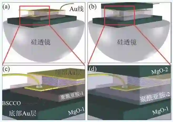 高温超导太赫兹辐射源的辐射频率与器件电压有关,但实际背后本质的影响因素却是器件的冷却与散热性能,这一性能会决定太赫兹辐射源能达到的最高器件电压,从而影响辐射频率。辐射源器件的热表现与器件衬底的材料、BSCCO单晶与衬底之间的接触、BSCCO单晶散热的途径等诸多因素有关。2014 年,我们研究团队在BSCCO 单晶散热途径上取得突破,在gold—BSCCO—gold 结构高温超导太赫兹辐射源器件上叠加了第二块衬底而形成了三明治结构,极大地改善了器件的整体导热性能,如图11 所示。增加另一块衬底意味着增加了一条散热途径,使得相同浴温和电流偏置情况下,BSCCO单晶的温度更低,从而辐射出频率更高的太赫兹波。在此之前,超导太赫兹辐射源的最高频率大约为900 GHz,而采用三明治结构改善器件导热后,辐射频率突破了1 THz。
