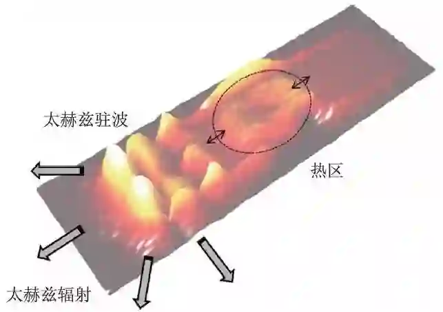自2007 年开始陆续有关于用高温超导BSCCO单晶制备太赫兹辐射源的报道,该种太赫兹辐射源具有辐射功率可观、辐射频段适中(300 GHz—2.4 THz)、辐射频率连续可调等若干独特的太赫兹辐射性质。同时高温超导BSCCO太赫兹辐射源器件工作时,其内部还存在太赫兹驻波、热区等新奇的器件物理现象,如图4 所示,值得深入研究。