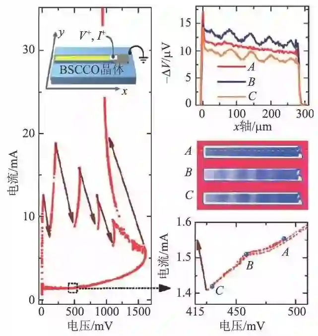 对于半导体激光器、量子级联激光器等而言,产生激光的一个重要前提条件是存在谐振腔,且辐射激光的波长刚好满足谐振条件。在高温超导太赫兹辐射源的研究过程中,理论上也详细地分析了几何谐振对辐射的影响。在实验上,我们研究团队利用低温扫描激光显微镜对高温超导BSCCO 太赫兹辐射源进行了研究,在器件中发现了对应于谐振的电磁驻波。如图10 所示为低偏的驻波,在40×300 μm2的长方体有源区器件中,在偏置点B 和C上发现了沿着长边分布的电磁驻波,而在偏置点A 上则不存在这种驻波。该电磁驻波被认为与太赫兹辐射的产生有关。图4 所示则为高偏区域驻波与热区同时存在时的状态。