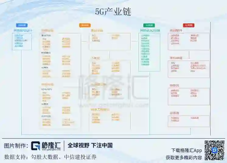拆分来看,5G产业链从源头的3GPP(国际通信标准协会),到上游芯片设计商、再到中游的网路通信设备,最终到下游的消费终端,均有华为的身影。