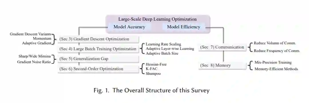 深度学习在人工智能的广泛应用中取得了可喜的成果。更大的数据集和模型总是产生更好的性能。然而,我们通常花更长的训练时间在更多的计算和通信上。在这项综述中,我们的目标是提供一个清晰的草图,关于优化大规模深度学习的模型准确性和模型效率。我们研究最常用于优化的算法,阐述大批量训练中出现的泛化缺口这一有争议的话题,并回顾SOTA解决通信开销和减少内存占用的策略。