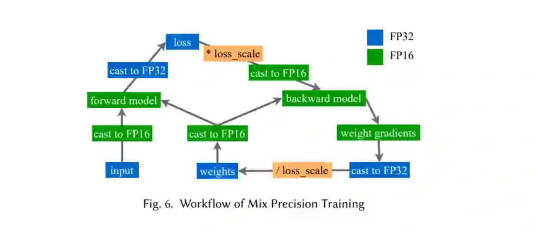 更大的模型通常需要更多的计算和内存资源来训练。训练这些模型所需的内存数量可能比单个GPU上可用的内存数量大几个数量级。在本节中,我们将看到一些流行的技术如何成功地在不影响模型性能的情况下降低训练神经网络的内存需求。第8.1节介绍了混合精度训练[72]如何使用更少的位来保留训练期间的权值和梯度,从而降低内存负担。第8.2节介绍了两种有效内存的自适应优化器,Adafactor[93]和SM3[10]。与上述方法正交,ZeRO[81]不改变模型优化方法,也不影响模型收敛,而是通过消除数据并行中的冗余来降低内存成本(章节8.3)。