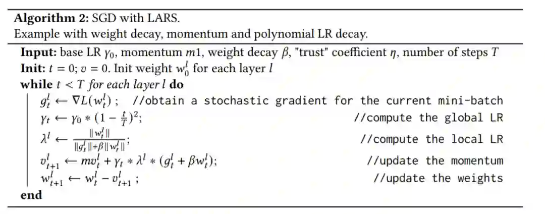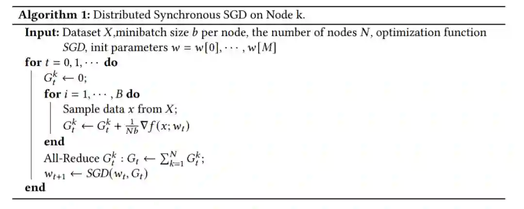 因此,近年来,学术界和工业界对在具有更高计算能力和内存限制的TPU和GPU等设备的大集群上扩展DL和分布式训练的兴趣激增。数据并行已经成为分布式训练的主要实践。它将一个大的批处理分布到多个设备,其中每个设备持有一个相同的模型副本,计算局部批处理的梯度,最后在每次迭代收集梯度来同步参数更新。通过最新的优化技术,它现在能够在成千上万的GPU设备上训练非常大的批量。然而,这种规模的训练需要克服算法和系统相关的挑战。其中一个主要的挑战是模型精度在超过某一点(例如32k)时的大批量下降。单纯地增加批处理大小通常会导致泛化性能下降,并降低计算效益。此外,我们不能总是通过使用更多的处理器来提高训练速度,因为通信成本是不可忽略的开销。多处理器协同训练一个任务可以减少整体训练时间,但相应的处理器间通信成本很高,限制了模型的可扩展性。更糟糕的是,拥有数百亿到数万亿参数的模型显然无法装入单个设备的内存中,简单地增加更多设备也无助于扩大训练规模。这种限制阻止DL研究人员探索更高级的模型体系结构。现有的工作研究和开发了克服这些问题的优化技术,以加速大规模深度神经网络(DNN)的训练。我们将这些工作分为两类,一种努力在大规模设置下保持/提高模型的准确性,另一种强调模型的效率,设计不太需要通信和内存的算法。重要的是,它们不是相互排斥的,而是可以协同使用,以进一步加快训练。