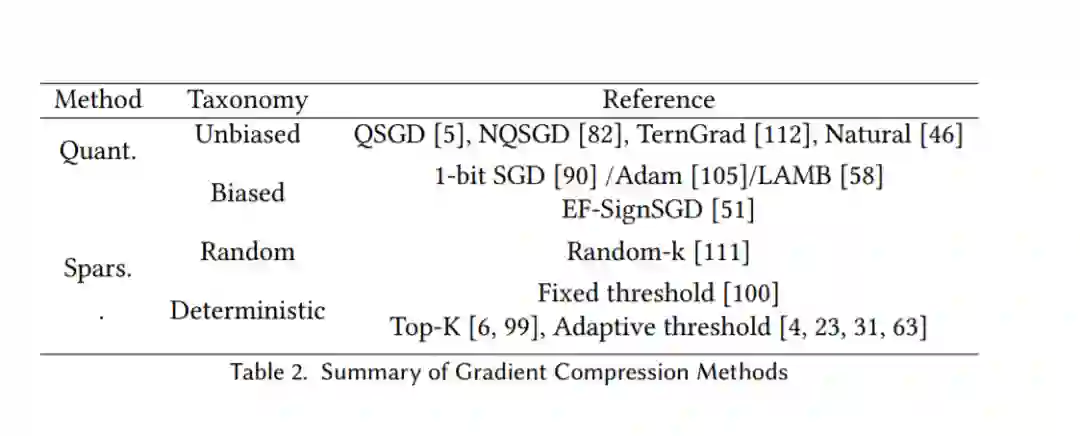 大规模分布式训练提高了训练更深、更大模型的效率,其中采用了数据并行,充分利用了多个workers的计算能力。SGD计算效率高,并且得到了DL工具包TensorFlow[1]、PyTorch[77]和DeepSpeed[83]的良好支持,因此通常被选择为优化方法。在数据并行的SGD中,每个worker处理其训练数据的随机小批,然后通过一个All-Reduce步骤或通过一个集中的参数服务器来同步本地更新,该服务器聚集了来自所有worker的随机梯度,并采取Broadcast步骤,将更新后的参数向量传送回所有workers。重复梯度同步的过程,直到满足适当的收敛准则。