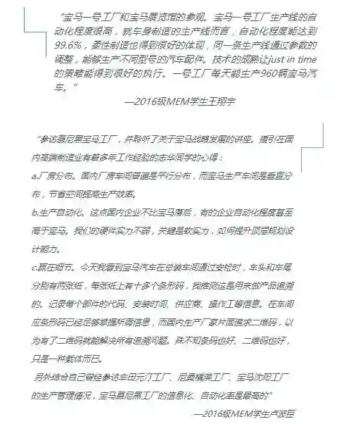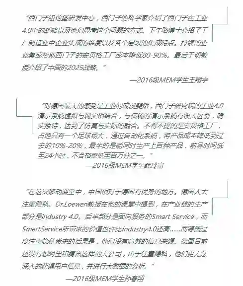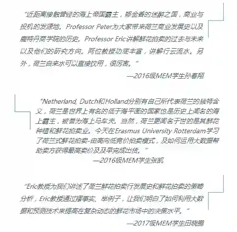 “本期参访MEM学员来自制造业、互联网、能源、物流、通信等产业,在参观学习过程中,每到一站,学员们认真聆听之余都会结合自身产业背景和讲座嘉宾或讲解人员就各类问题展开热烈讨论,大家都十分希望通过此次欧洲之行能够学到先进经验并对自己的工作能够有所帮助。无论是慕尼黑宝马总部整洁有序的汽车生产线,还是西门子首席工程师对工业4.0深入浅出的讲座,亦或是科隆大学Thonemann教授对供应链的精彩讲解,以及荷兰皇家鲜花公司表面平静实则紧张非凡的鲜花拍卖,还有鹿特丹抽沙填海的壮观人造港口,等等诸多课程学习让学员们收获匪浅、受益良多。”