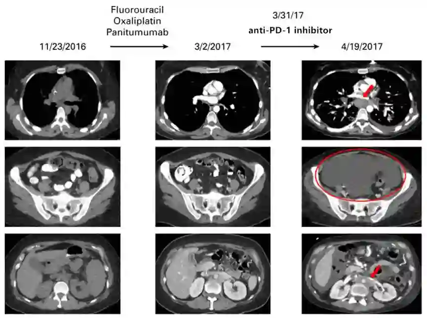 患者女,36岁,患胃食管交界处腺癌[10]。在接受氟尿嘧啶、奥沙利铂和帕尼单抗二线治疗时,病情稳定(下图,左边和中间),由于患者出现亚厘米淋巴结病变,方案改为PD-1抑制剂。治疗3周内,患者纵隔、腹膜后淋巴结进展迅速,出现大量腹水,进展速度较检查点阻断前4个月增加6.4倍,肿瘤负荷较免疫治疗前影像学增加460%。随后治疗改为氟尿嘧啶、奥沙利铂和曲妥珠单抗,但患者在使用PD-1抑制剂1.5个月后死亡。原发肿瘤的分子表达谱发生多个突变(Foundation Medicine, Cambridge, MA),包括MDM2、ERBB3、ARAF、CDK4和EGFR的扩增,以及PIK3CA、FRS2、GLI1和IKZF1的突变。TMB较低,微卫星稳定。未进行免疫组化检测PD-1和PD-L1。该病例提示,MDM2扩增可作为免疫检查点抑制剂的潜在进展标志物。