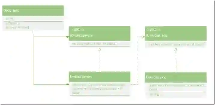 基于以上, 如何通过一种模式来简化这种调用形式, 继而使大家在调用的时候不需要关心该服务是在本地(本地类库依赖)还是远程, 只需要按照常规方式使用即可, 至于是直接使用本地服务还是通过http发送远程请求,这个都交给框架处理.为了方便叙述, 本文假定以销售订单和用户服务为例. 销售订单服务对外提供一个创建订单的接口.订单创建成功后, 调用用户服务更新用户积分.UML参考如下.