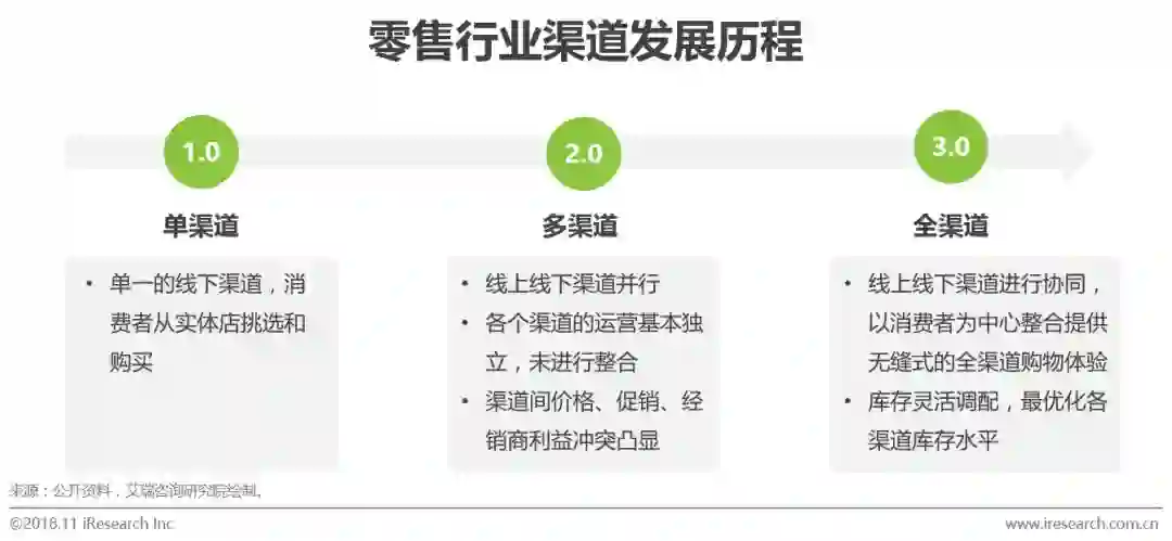 从渠道的发展历程来看,中国零售行业历经单一线下渠道,线上线下渠道并行两大阶段,目前已经逐步走向了线上线下全渠道融合的新阶段,供应链、物流、营销、服务方式也随之升级。