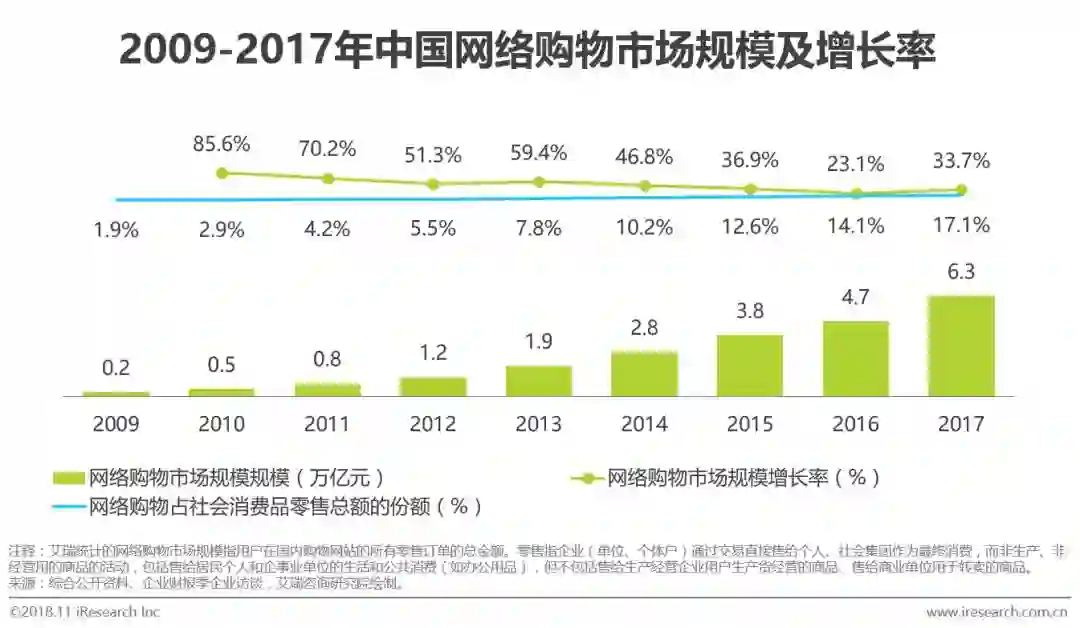 双十一成绩不断刷新的数据背后,是中国网络购物高速发展的十年。2009年,中国智能手机尚未普及,网购用户规模刚刚突破1亿,电商在中国还仅仅是星星之火。十年过去,2017年中国网络购物规模已达6.3万亿元,相较2009年的0.2,增长了31倍,网络购物占中国社会消费品零售总额的比例从2009年的1.9%增长到了2017年的17.1%,网络购物已经成为居民生活不可或缺的重要部分。