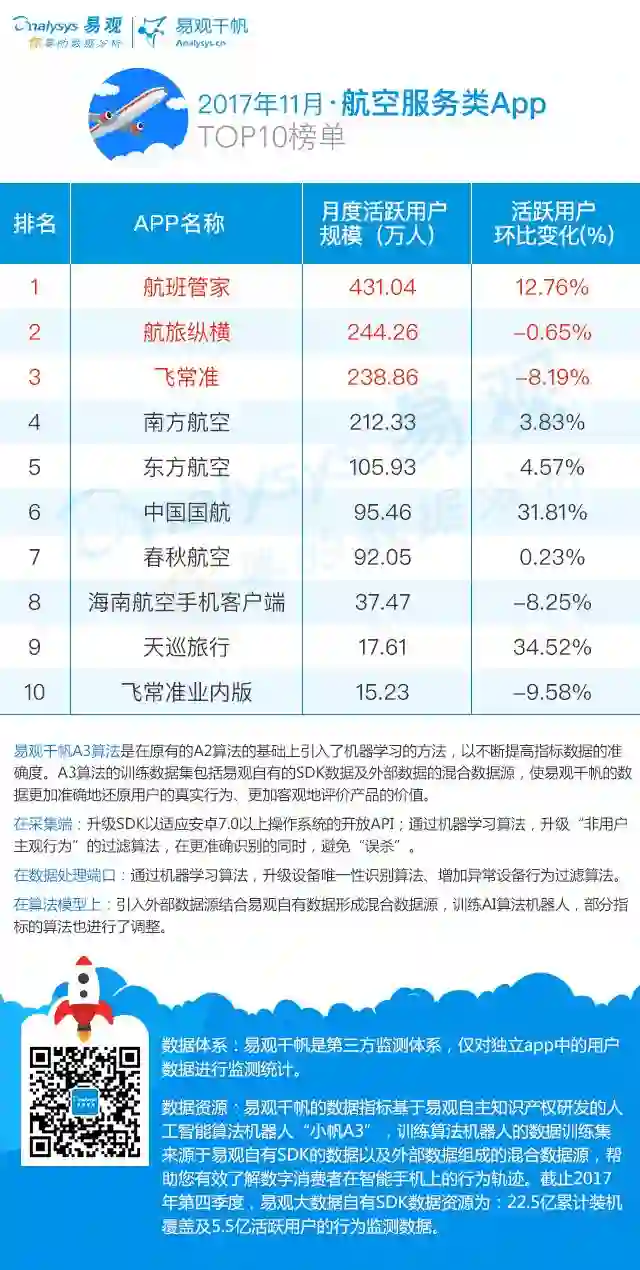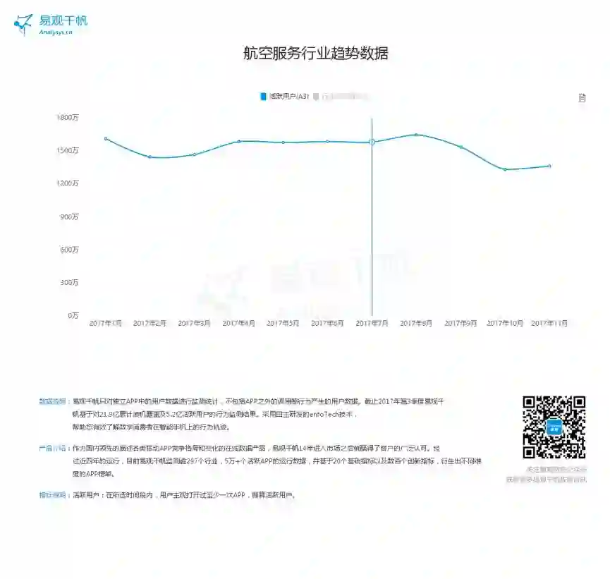 根据易观千帆数据显示,2017年11月,航空服务领域收录App20个,整体活跃用户规模1361.35万,环比上升2.45%,启动次数11171.11万次,环比上升1.33% ;使用时长482.34万小时,环比上升2.27% 。