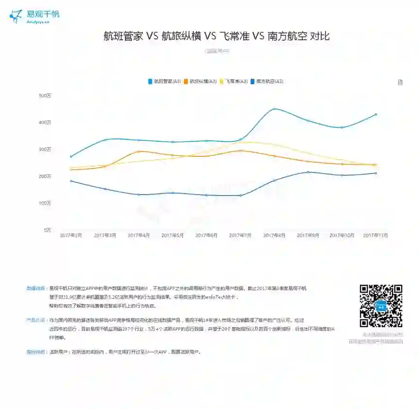 2017年11月航班管家、航旅纵横、飞常准及南方航空用户规模对比