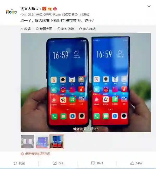 今天早上,OPPO 副总裁沈义人通过微博公布了全球首款“瀑布屏”真机,从曝光图来看,瀑布屏将拥有更高更接近于 100 % 屏占比,屏幕正面仅有超窄的上下边框,没有任何物理开孔,同时屏幕弯曲度也将更高,达到 88°。