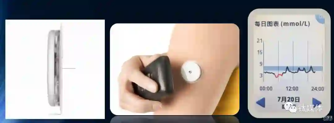 图为雅培辅理善瞬感系统,从左到右依次为传感器、血糖扫描仪、数据显示屏幕
