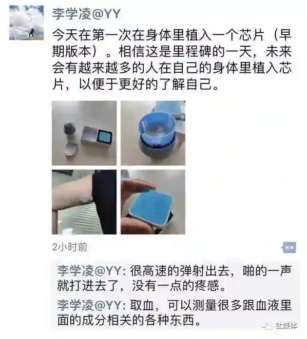 10月22日,欢聚时代(YY)联合创始人、董事长兼CEO李学凌在朋友圈晒出几张照片,并配文称“今天第一次在身体里植入一个芯片(早期版本)。相信这是里程碑的一条,未来会有越来越多的人在自己的身体里植入芯片,以便于更好的了解自己。”