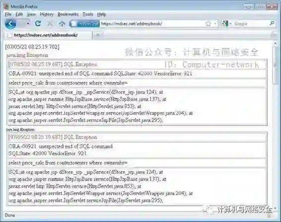 应用程序的一个关键防御机制是合理地处理无法预料的错误,要么纠正这些错误,要么向用户发送适当的错误消息。在生产环境下,应用程序不应在其响应中返回任何系统生成的消息或其他调试信息。过于详细的错误消息非常有利于恶意用户向应用程序发动进一步攻击。有些情况下,攻击者能够利用存在缺陷的错误处理方法从错误消息中获得敏感信息;此时,错误消息成为攻击者从应用程序中窃取数据的重要渠道。图6显示了一个由无法处理的错误生成的过于详细的错误消息。