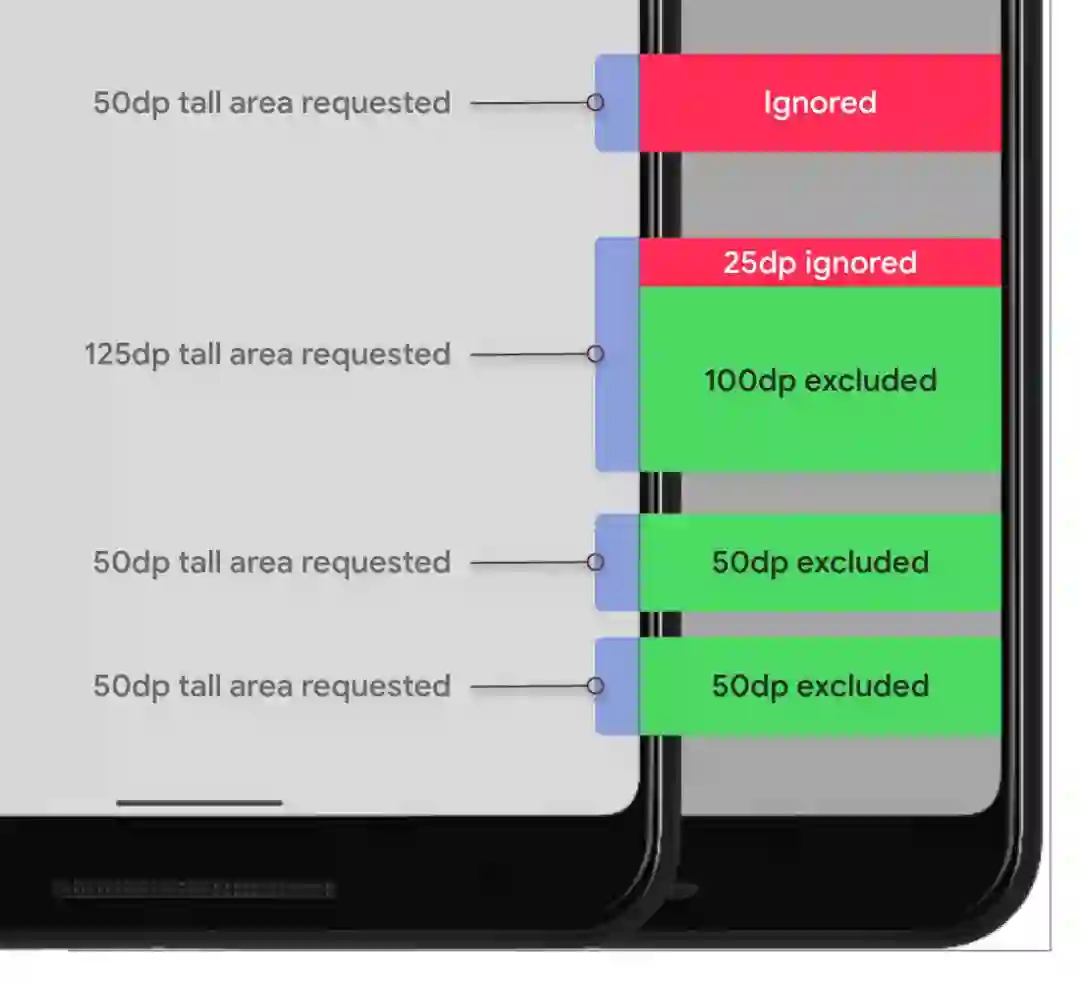 手势区域排除 API 通常会在两个地方被调用: 当视图被布局时 (onLayout),或是当视图被绘制时 (onDraw)。您的视图会传入一个 List<Rect>,其中包含应该切出 (即不响应系统手势) 的矩形区域。如前所述,这些矩形须位于视图自己的坐标系中。