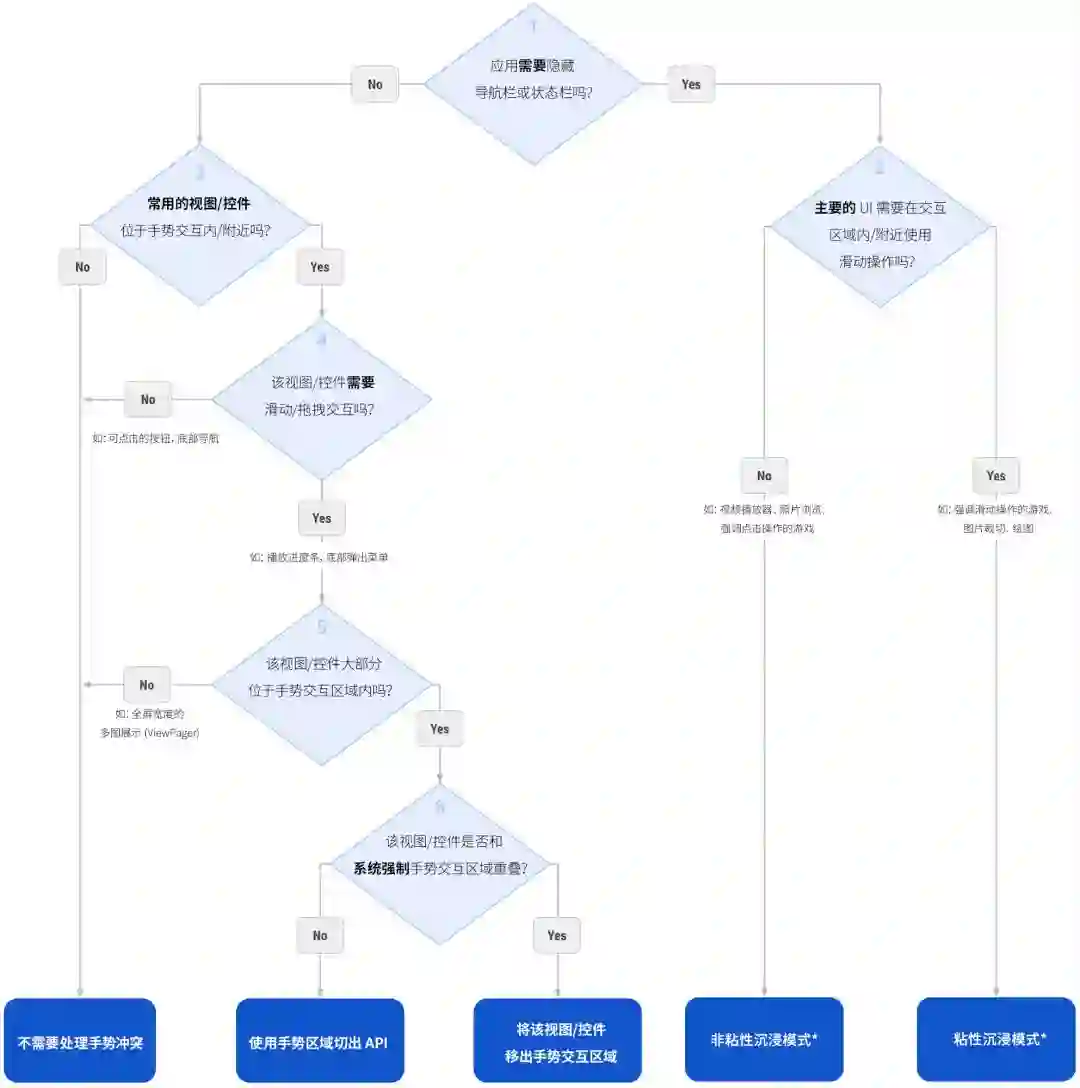 如果您的视图放置在一个可滚动操作的容器 (如 RecyclerView) 中,那么请这么理解这个问题: 该视图是否完全或大部分位于手势交互区域中?如果用户可以将视图滚动到手势交互区域之外,则应该视为没有交互冲突。