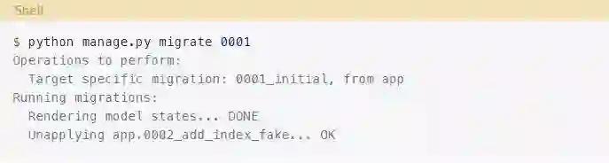 我们对第二次迁移进行了反转,Django删除了索引。现在可以安全地删除迁移文件了:
