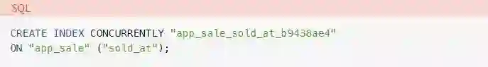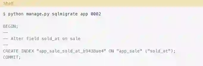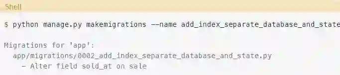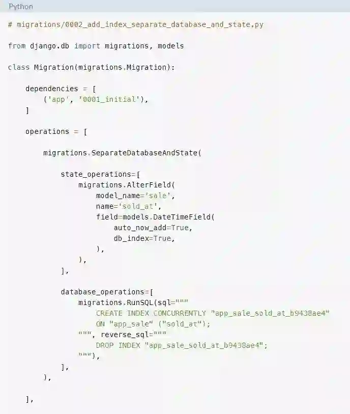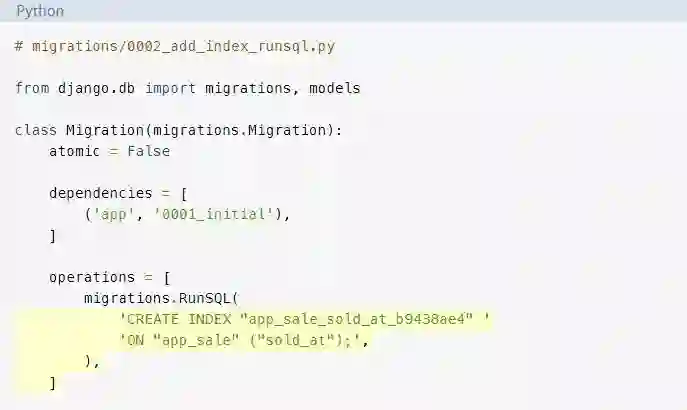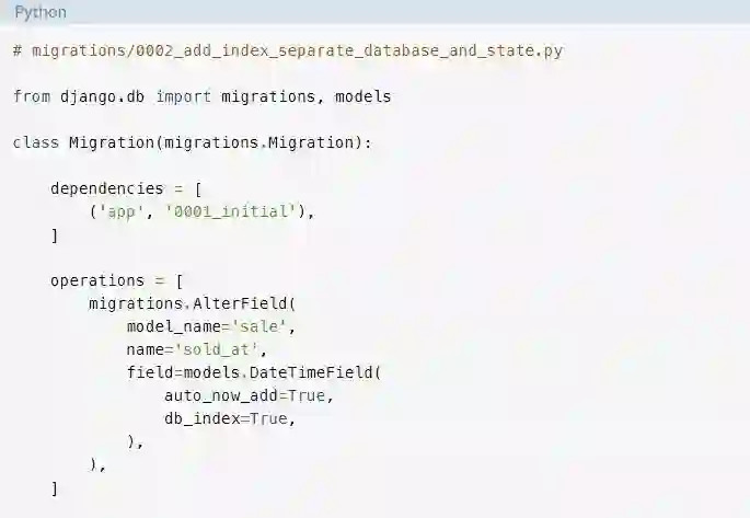 Django在字段sold_at上生成了一个AlterField操作。该操作会创建一个索引并更新状态。我们希望保留这个操作,但是在数据库中提供一个不同的命令来执行。