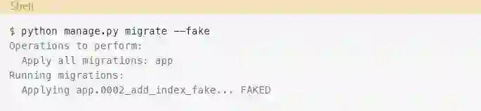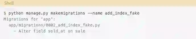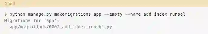 第一种方法是手动创建索引。你将生成迁移,但实际上并不会让Django应用它。相反,你将在数据库中手动运行SQL,然后让Django认为迁移已经完成。