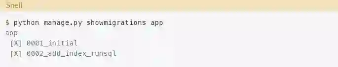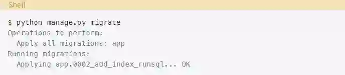 Django提供了一种使用RunSQL在迁移中执行原始SQL的方法。我们来尝试使用它代替直接在数据库中执行命令。