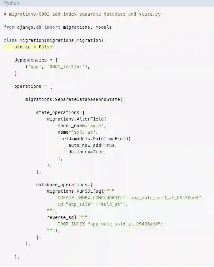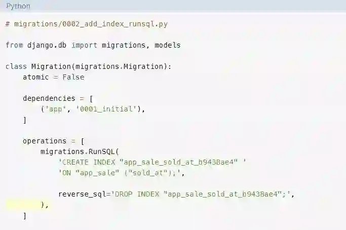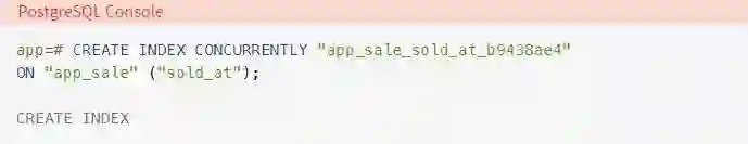如果按原样运行这个迁移,那么Django将在表上创建索引,并且它将被锁定,直到索引完成。在非常大的表上创建索引可能需要一段时间,你希望避免停机。