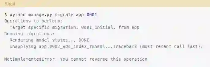 要使RunSQL操作可逆,你必须提供在操作反转时执行的SQL。反向SQL在reverse_sql参数中提供。