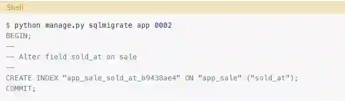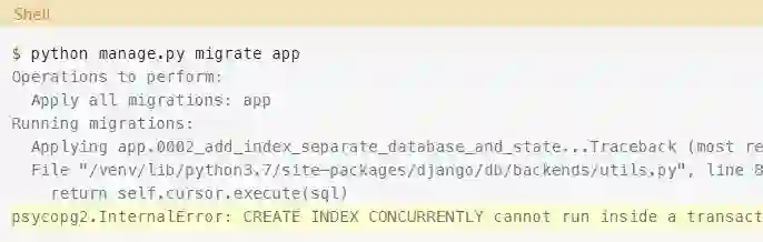 在生成迁移时,Django不会使用这些特殊的关键字。按原样运行迁移将使数据库获得表上的独占锁,并在创建索引时防止DML操作。