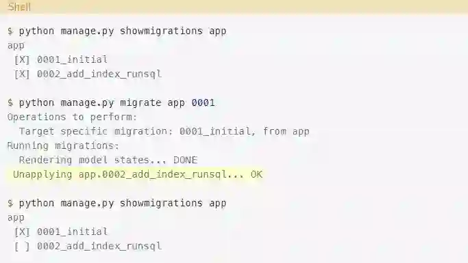 要进行一次逆向迁移,Django会对每个操作执行相反的操作。在本例中,添加索引的反面是删除索引。正如你已经看到的,当一个迁移是可逆的时,你可以取消应用它。就像你可以在Git中使用checkout一样,如果你对较早的迁移执行了migrate命令,你可以进行逆向迁移。