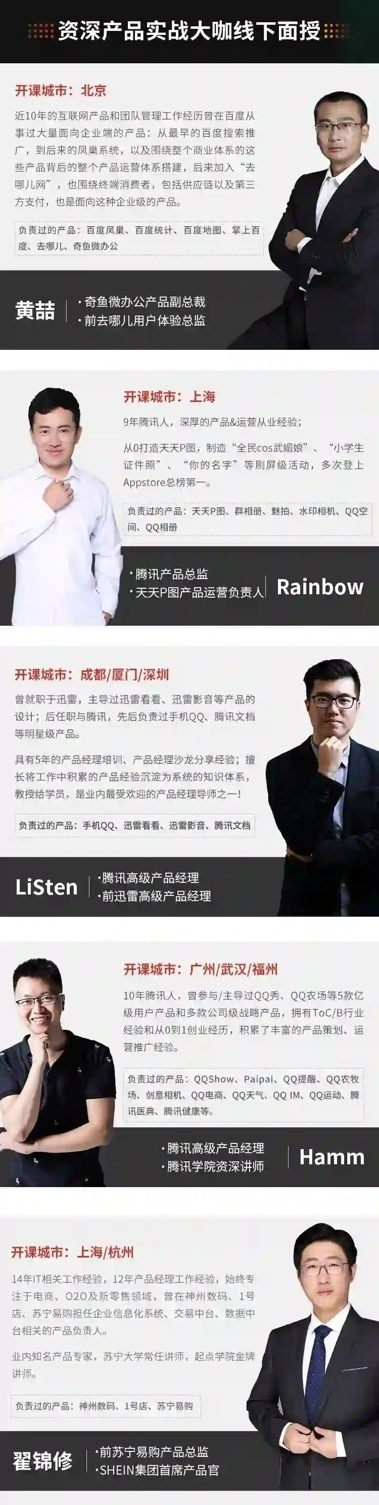课程特邀5位10年+产品经验的老司机,线下亲自授课,尤其适合1~3年的产品从业者。