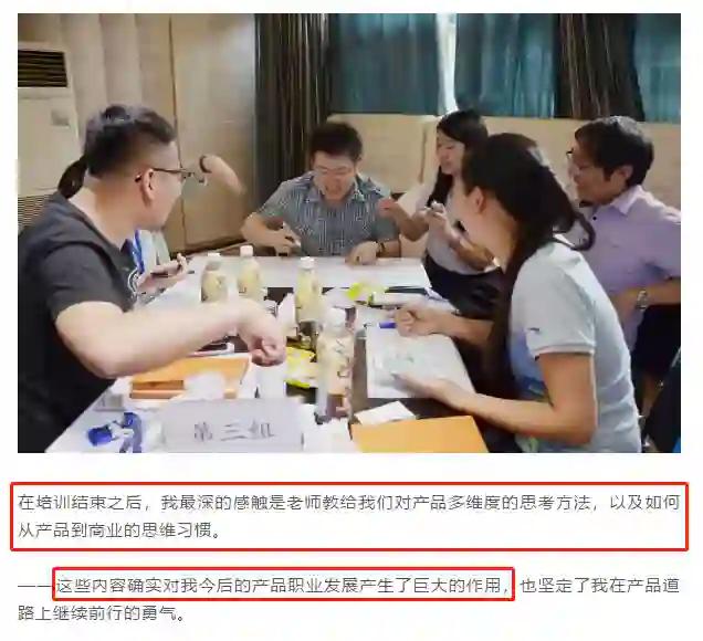 比如,17年【产品经理实战训练营】的老学员,通过实战营的学习,将所学方法很好的运用在自己的工作中,在3年后拥有了自己的产品团队,并带着自己的产品团队重返产品实战营学习。