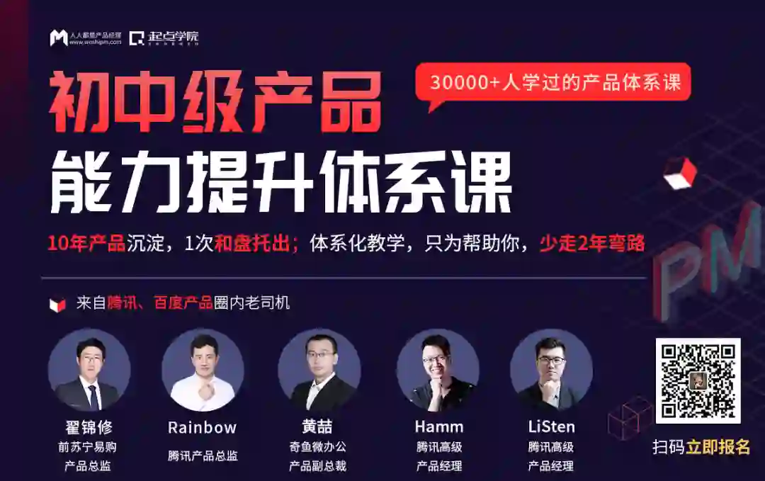 如果你也想掌握一套系统的、经过大厂验证的产品知识与方法;培养自己的认知——关于不同行业内产品工作的“共性”与“差异”;链接更多优秀的产品人,让自己具备跨行业的快速学习能力,拥有深度思考能力和广阔的产品视野。