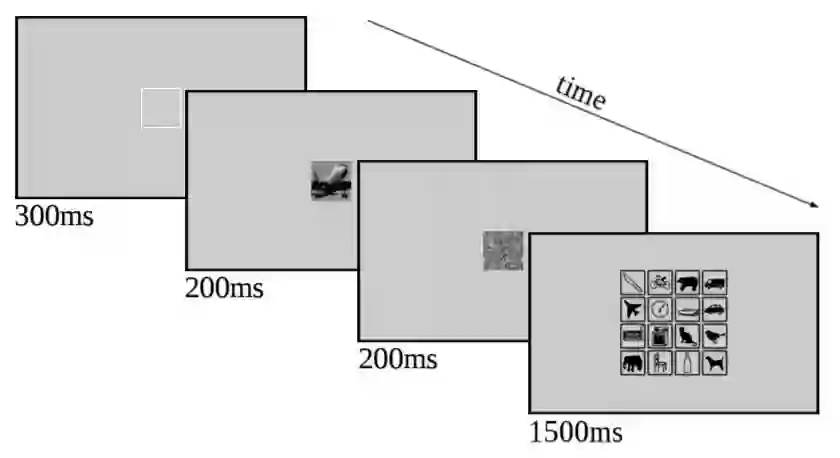 图 1. 实验原理图。在呈现出一个中央固定方块之后(300 ms),图像在 200ms 的情况下可视,紧接着是一个 1/f 频谱(200ms)的噪声屏蔽(noise-mask)。然后,在 1500ms 时出现一个响应屏,在这里观察者可以点击一个类别。注意我们在这张图中增强了噪声屏蔽的对比,这是为了在出版时拥有更好的可视性。从上到下的类别分别是:刀具,自行车,熊,卡车,飞机,表,船,小汽车,键盘,烤箱,猫,鸟,大象,椅子,瓶子,狗。这些图示是 MS COCO(http://mscoco.org/ explore/)版本的修改版。