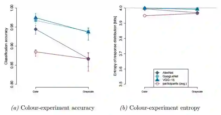 图 2. 颜色试验结果(n=3)。(a)精度。DNN 对应蓝色,人类对应红色;菱形对应 AlexNet,方形对应 GoogLeNet,三角是 VGG-16,圆圈是人类观察者。(b)响应分布熵(Response distribution entropy)。