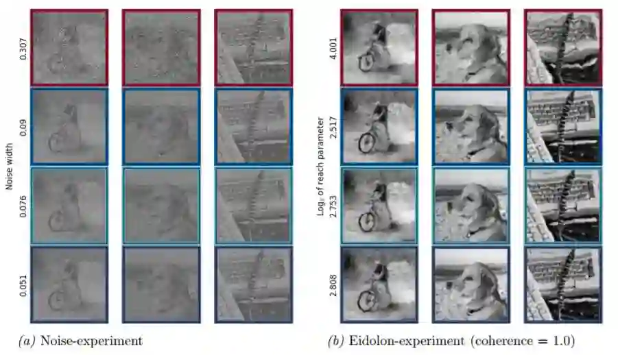 图 4. 预估刺激信号(Estimated stimuli)对应 50% 分类精度。(a)噪声实验。(b)Eidolon 实验。连贯性参数=1.0。首行:刺激信号(stimuli)对应平均人类观察者的阈值(threshold)。底下三行:刺激信号对应 VGG-16(第二行), GoogLeNet(第三行)和 AlexNet(最后一行)的相同精度。