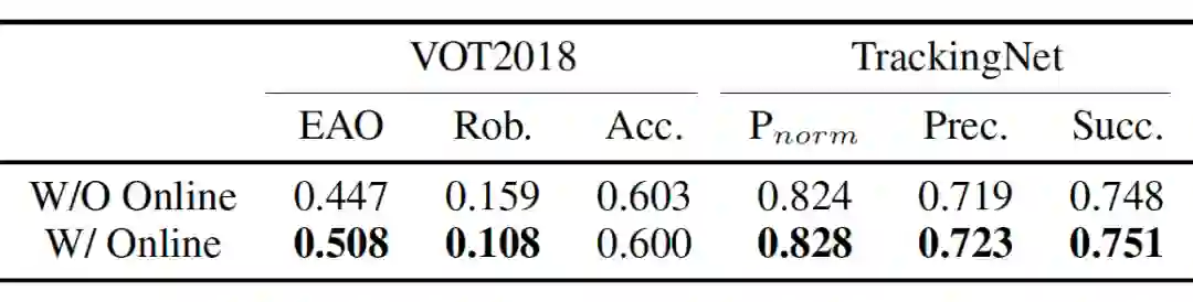 从 VOT2018 和 trackingnet 可以明显的看出回归分支在线训练的作用,而 VOT 的 accuracy 这个指标之所以比不用在线训练低,是和 vot 的测试方式有关的。在 vot 数据集的测试过程中,如果跟丢了目标就会计作 lost 一次,重新给定目标的真实框进行跟踪。